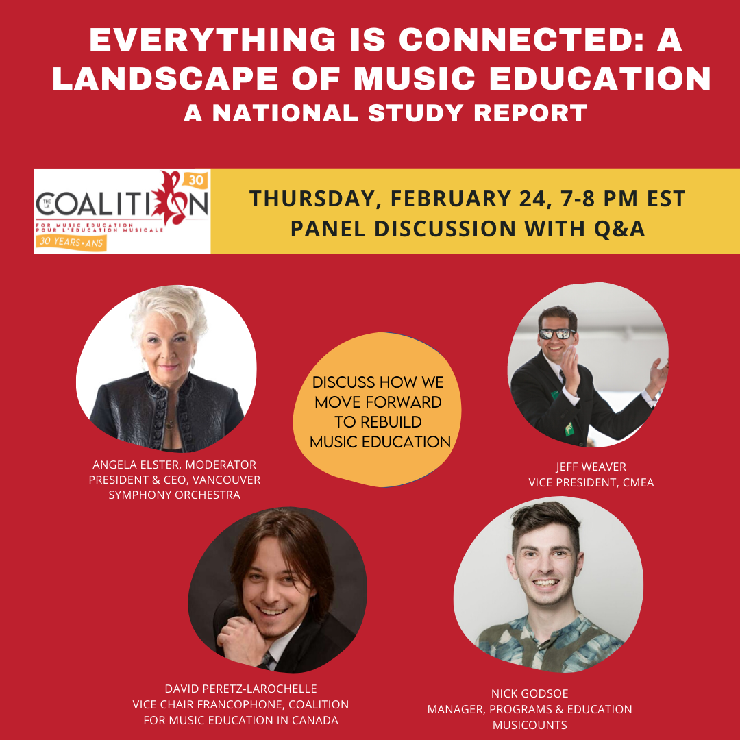 The Coalition for Music Education in Canada will be hosting a virtual launch event and discussion panel on Thursday, February 24th at 7pm EST, to review the findings of a National Study three years in development.