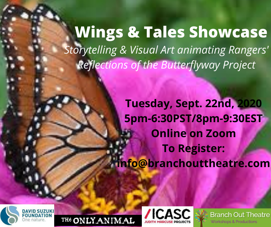 An evening of online visual art, poetry and storytelling from the participants in the Wings & Tales Project- a partnership project between Branch out Theatre and David Suzuki Foundation as part of Futures/Forward Mentorship Program led by International Centre for Arts and Social Change. Branch Out Theatre Artistic Director, Naomi Tessler, mentored by Kendra Fanconi, Director of The Only Animal, has led the Wings & Tales project, providing David Suzuki Foundation's volunteers of the Butterfly Way project who have been planting pollinator gardens across the country to create pollinator habitats and actively steward the Earth--a chance to creatively reflect on their journey of planting these beautiful gardens and supporting pollinators through the artistic medium of their choice. Our Showcase features the creative works of Butterfly way rangers across the country and we invite you to join us to hear, see and enjoy the Wings & Tales come to life online on Tuesday, Sept. 22nd!